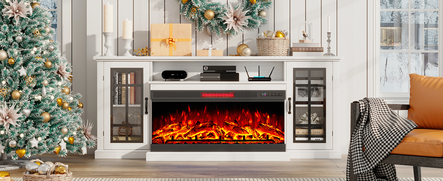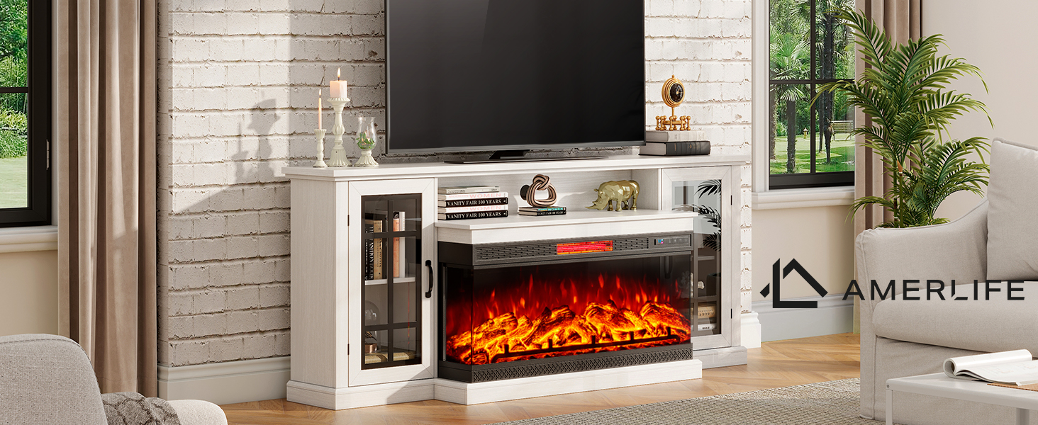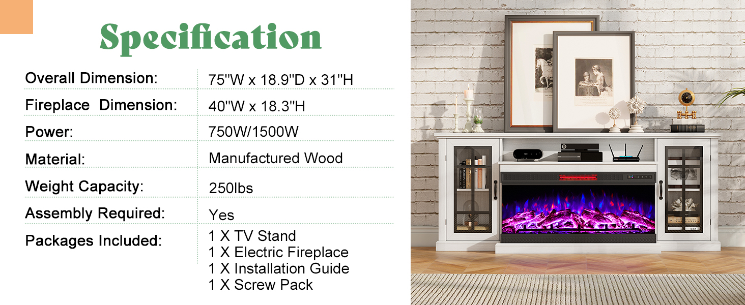 • Fits TVs 85"+ - AMERLIFE 75" TV Cabinet can accommodate TVs up to 85", including a 40" electric fireplace. TV Stand Dimensions: 75 W x 18.9 D x 31H in; Fireplace Dimensions: 40 W x 11 D x 18.3 H in.