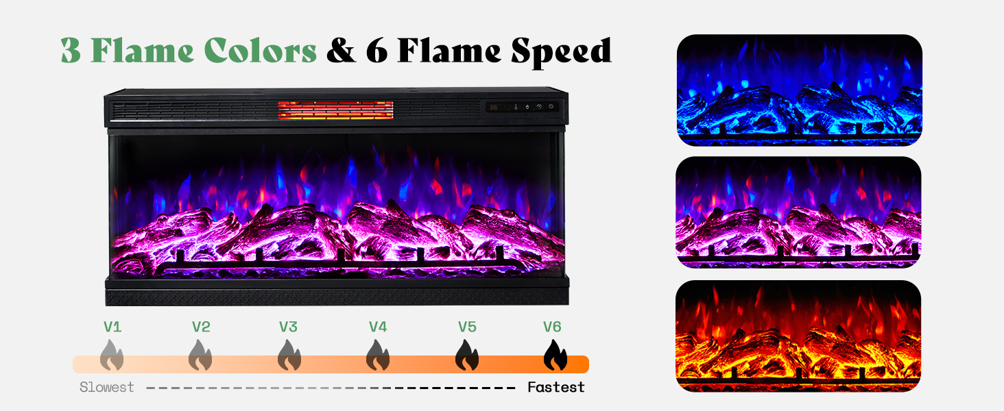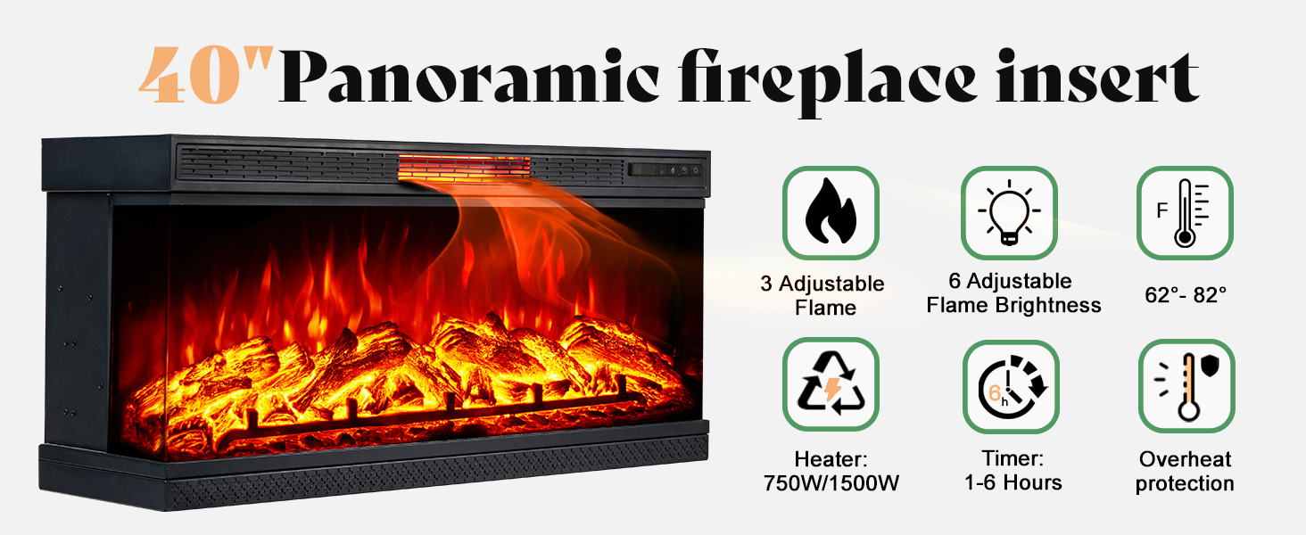 • 3-Side Glass Display - 40" Panorama fireplace allows you to enjoy 3 realistic flame colors and 6 levels of dimmer atmosphere from any seat in the room. Even on the sides, the glass surface allows you to admire the generous 4.7" wood log.